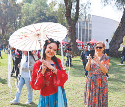 在墨西哥第四届中国新年文化节上,当地青年身着中国传统服饰留影纪念。