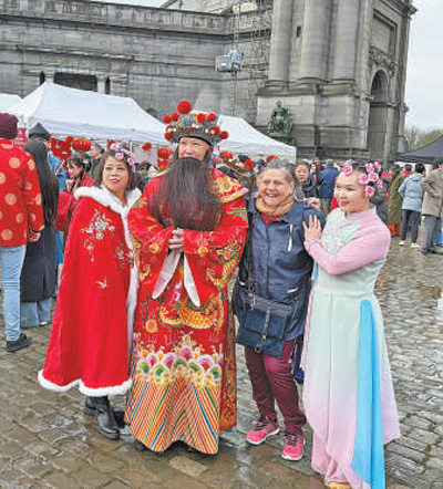 在比利时布鲁塞尔举办的“中国春节游园庙会”上,当地观众与庙会演员合影。