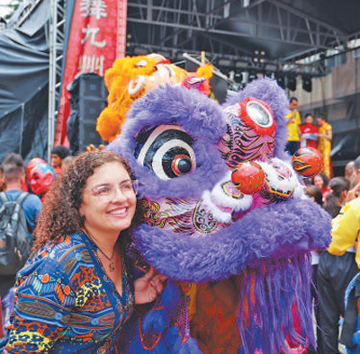 当地时间2月1日,在巴西圣保罗市中心自由广场举办的欢乐春节园游会开幕式上,当地民众与舞狮表演者合影。
